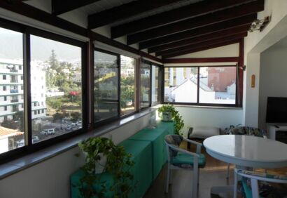 Spacious top floor flat in a quiet, central location in Puerto de la Cruz. The flat is open-plan and bright. The large windows offer a panoramic view of the sea, Teide and the city. It offers a lot of privacy as it is the only flat on the floor and therefore has no direct neighbours. The well-kept building with only 11 units has a lift and is located in a pedestrian zone. There is a small terrace in front of the private entrance and the flat also has a storage/laundry room. A chic city flat that is also interesting as an investment, as there is a "VV" rental licence.