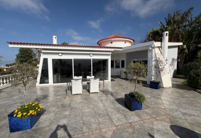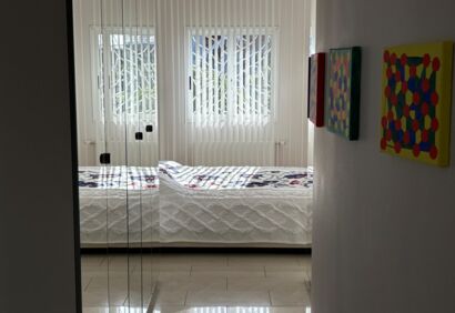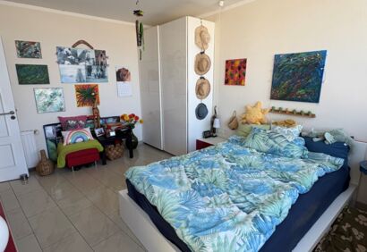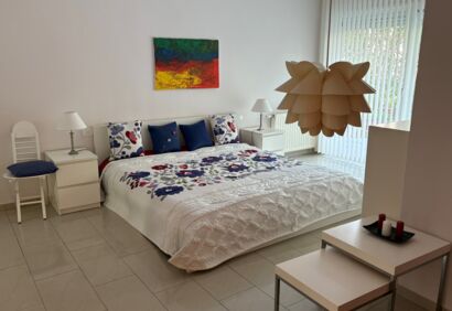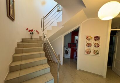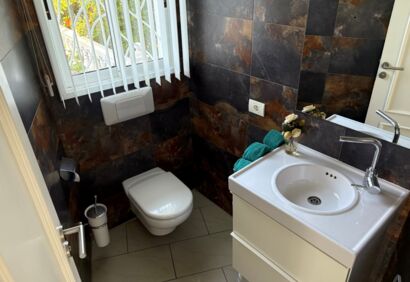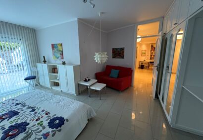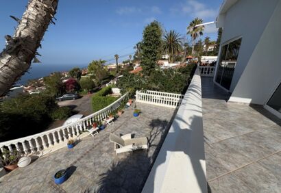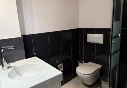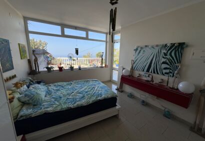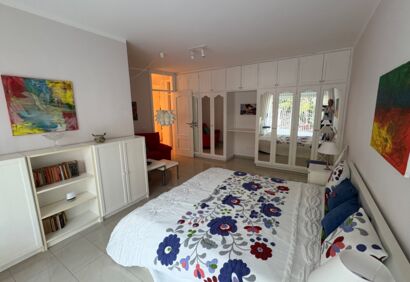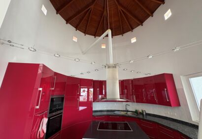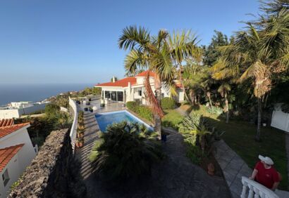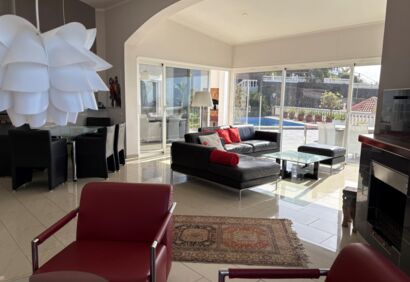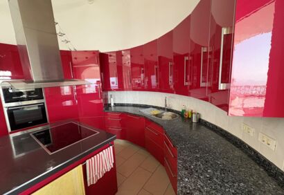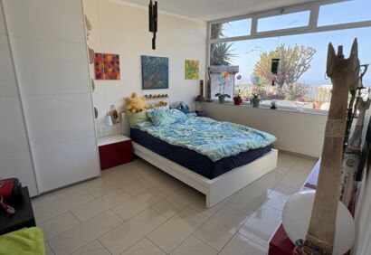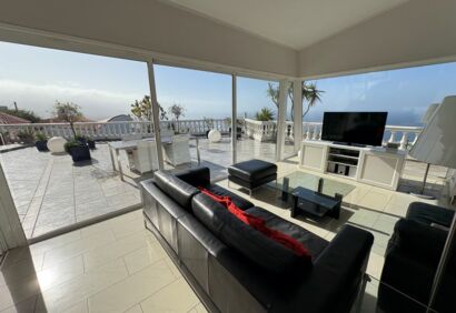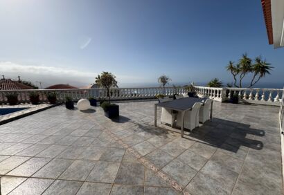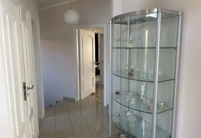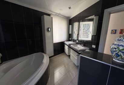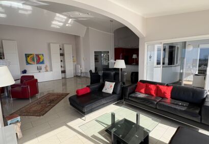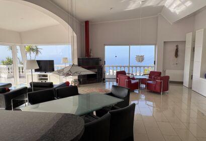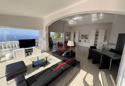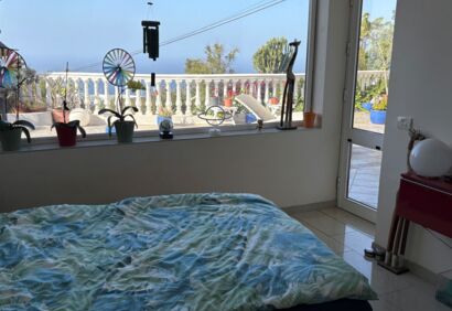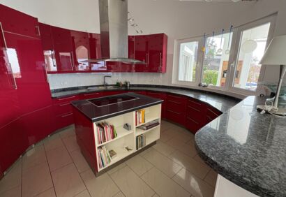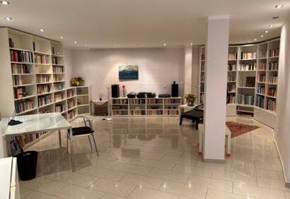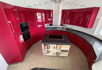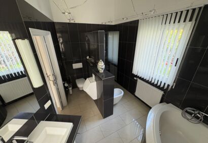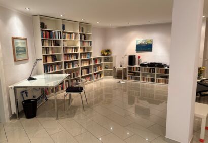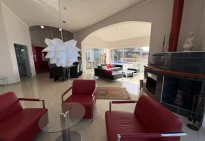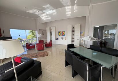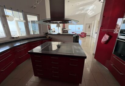 Villa with modern architecture in an impressive panoramic location. The house impresses with its well thought-out floor plan with large, high and bright rooms. The high-quality furnishings and materials used leave nothing to be desired. On the upper floor is the spacious living room with round kitchen which is located in a turret and is open to the living room. A bedroom with en suite bathroom and a guest WC. On the lower floor there are a further three bedrooms, one of which has its own living room, two bathrooms and a multifunctional room which is suitable for many purposes such as a library, gym, home cinema, etc. An impressive property with superior living quality. The property is in mint condition and technically perfectly equipped with a new heat pump, central heating and an open fireplace in the living room for cosy hours. The price includes a 1,490 m² building plot directly below the villa.